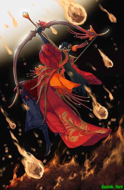 “黑犬犬无组织无纪律”的同人画与“苍南野兽”有着异曲同工之妙,并且似乎结合了有关司羿的神话故事。在同人画中,司羿同样拉满弓箭,然而背景中都是似乎是从天而降的冒火石块,大概就是金乌的攻击。但是司羿面不改色,一发射日之箭已经蓄势待发。