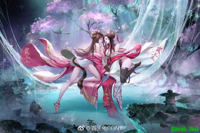 和“阿飘_亚玖”的画风相似,“霸王兔”走的也是温柔的画风,但是在她创作的阿织同人图中却多了另外一些特别元素。淡蓝和粉丝的背景前,除了妩媚动人的阿织以外,涂山小月也跃然与纸上,两人紧紧相依在一起,仿佛个中有一些不为人知的特别情愫。