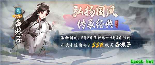 即日起至4月2日14时,降妖司精心推出“弘扬国风 传承经典”白娘子百抽福利卡池,该卡池仅有白娘子一名SSR妖灵,最多能进行十次十连召唤,且十次十连召唤内必得SSR妖灵!与此同时,白娘子还将和小青一同加入“山河照影”限时召唤池,召唤概率大幅提升。邂逅白娘子的绝佳机会,降妖师们切勿错过!
