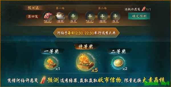 每日,河伯将举办两场选秀大典,降妖师使用每日免费领取、开启“福缘母贝”等方式获得的河伯许愿笺,即可预测选秀结果,预测成功就有机会赢得妖市信物、妖灵纪念币等珍贵奖励,妖灵纪念币可用于在伯乐坊内兑唤包括风伯、雨师限定皮肤“金风素羽”、“彤云出岫”在内的道具。活动期间,“鱼生有你跃龙门·复刻”卡池还将限时开启,风伯、雨师、小青、娴婵抽取概率大幅提升,等待你的召唤!