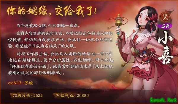 小喜则出身于声名显赫的月老家族,身为同龄人中佼佼者的她对自己十分严格,希望早日成长为名扬天下的大媒,在遇见银星之后,不知她的月老“生涯”将产生怎样的变化。