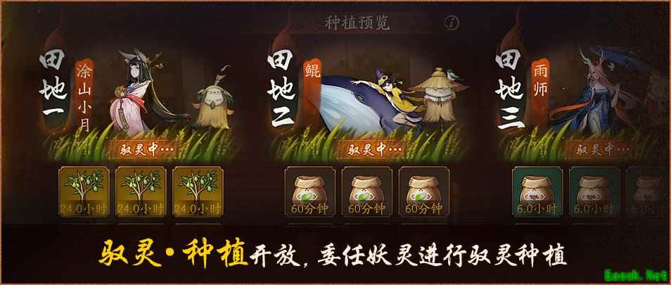 夏日闲情,田间耕种西峰煮茶 气温不断攀升的夏日,也是万物繁茂成长的大好时节。本次更新后,驭灵·种植功能正式开放,完成种植·四成就后,降妖师即可派遣三位妖灵在空余的田地中进行种植,消耗种植密要,派驻的妖灵就会为你辛勤耕耘,收获农作物。