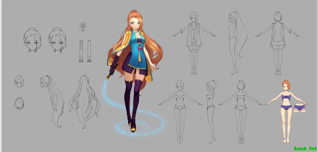 我们发现此版的肖凝儿衣着服饰太过于平庸了,没什么特色,3D成型效果也不理想。表情跟发色都显示出来年龄过小,我们的故事不仅仅是圣兰学院时期的故事,很难满足以后的剧情需求,所以果断舍弃了。 有了第一版的铺垫,第二版可以说是小心谨慎。我们通过细品原作之中角色的身材、外貌、动作各个方面来考虑,同时融入了更多的设计元素,试着让角色更加立体起来,紧接着出现了第二版的肖凝儿……