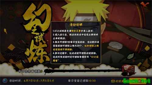 “幻之试炼” 成为“幻之征服者” 幻之试炼2.0即将来袭 参与“幻之试炼”,除了能够体验多变的趣味挑战,忍者学员每天还可领取一份每日宝箱奖励。参与活动过程中,达成成就可以领取到成就奖励,达成所有成就还可领取专属称号“幻之征服者”! 此外,为了让大家体验到更好玩的“幻之试炼”,“幻之试炼2.0”正在改版中,未来将会与各位忍者学员见面,尽请期待。