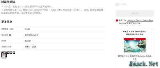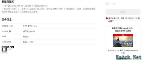 NS2版《塞尔达传说》升级包大小确认:10$付费升级