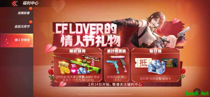 情人暖心福利活动 Q币现金唾手可得!上线即领丰厚福利 情人暖心福利人人有份!即日起,CF手游玩家上线即可100%领取1份专属福利。该福利有可能是Q币、现金、88-147钻,也有可能是永久武器 “爱心手雷” “AWM-情缘、斯泰尔-巧克力”等;玩家们可以从Q币现金/钻石(保底88钻)以及各式永久武器中随机获得一件。每个人所领取的福利有所不同,到底谁能领取丰厚的大奖?答案由你上线揭晓。 值得注意的是,该活动中提供的“AWM-情缘、斯泰尔-巧克力”、“爱心手雷”武器都具有很高的收藏价值。手持“斯泰尔-巧克力”武器,玩家就能感受到巧克力的浓郁浪漫搭配斯泰尔的迅猛直爽,异常浪漫;而投掷“爱心手雷”,玩家将能看到该手雷在爆炸时留下的满满爱心,还能听到独特的音乐声残留。 每日上线满满福利!累计登录更有惊喜 不仅仅是情人暖心福利,CF手游“每日领”搭配“累计登录送”两重福利活动还将让玩家们收获更多惊喜。活动期间,玩家每日上线即可领取保底的福利——抵扣券/钻石宝箱/经验卡等福利随机获取,三大件均为玩家们游戏“日用品”。 与此同时,当玩家上线累计一定的天数之后,还能够100%领取“双持Glock-倾心”(永久)福利! 作为一把双持副武器,该武器的载弹量有较好的优势;玩家只要手速够快,就能够把它当主武器使用。在这个暖心的节日,玩家们自然不可这么浪漫的武器啦。 “爱心手雷”等你来拿!“金鼠元宵节”仍在进行中 CF手游“金鼠元宵节”福利迎来收官日,玩家们今日(2月14日)上线还能领取“爱心手雷”道具。不仅如此,若此前玩家也参与过该活动,累计上线指定天数还能额外领取“累计签到礼”。