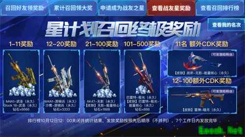 “战友星计划”福利活动-首期奖池 坐拥6666钻石+永久英雄级!星计划终极奖励出炉 除了每期更换的召唤奖励和奖池,CF手游“战友星计划”福利活动还设定了“星计划召回终极奖励”,犒劳全服全区最强的500名战友之星!活动期间,所有战友之星凭借成功召唤的玩家数量进行排名,召唤玩家数量越多排名越高;最终排行榜上前500名战友之星,将额外获得终极奖励。 其中,第1名至11名战友之星将获得M4A1-武圣(永久)、Glock18-武圣(永久)、6666钻石等福利!第12名至500名战友之星,将能分别获得888钻石至3333钻石不等的奖励,以及不同的武器、武器皮肤等奖励。此外,前100名战友之星还将拥有额外CDK奖励,用来答谢自己的粉丝——奖励包括【皮肤】战服-无影-能量核心(永久)或【皮肤】雷神-暗月(永久)等道具。