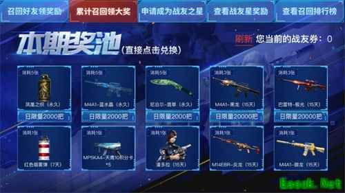 “战友星计划”福利活动 首期召唤奖励出炉!更有10项奖励任意兑换 目前,CF手游“战友星计划”福利活动首期召唤奖励已出炉。活动期间,战友之星成功召唤新玩家就能解锁斯泰尔-天使、源火麒麟50点成长值、10钻石、源计划激活卡等福利,轻松解锁全新武器。 不仅如此,战友之星每次成功召唤玩家都能获得“战友券”,凭借该道具可以兑换更多奖池道具。首期奖池奖励包括凤凰之炽(永久)、M4A1-蓝水晶(永久)、尼泊尔-翡翠(永久)、M4A1-黑龙、巴雷特-极光、红色烟雾弹、MP5KA4-天鹰10积分卡x5、潘萝拉、M14EBR-炎龙、M4A1-御龙等奖励。玩家最低只需消耗1张“战友券”就能兑换指定奖励。让人惊喜的是,奖池道具也将定期更新,玩家可以留着“战友券”兑换最钟爱的奖励。