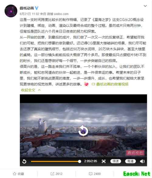 两分钟短片,耗时近半年 叠纸动画几天前曾在官方微博透露,《星海之梦》CG短片虽然只有两分半的长度,却耗时近半年的时间制作。
