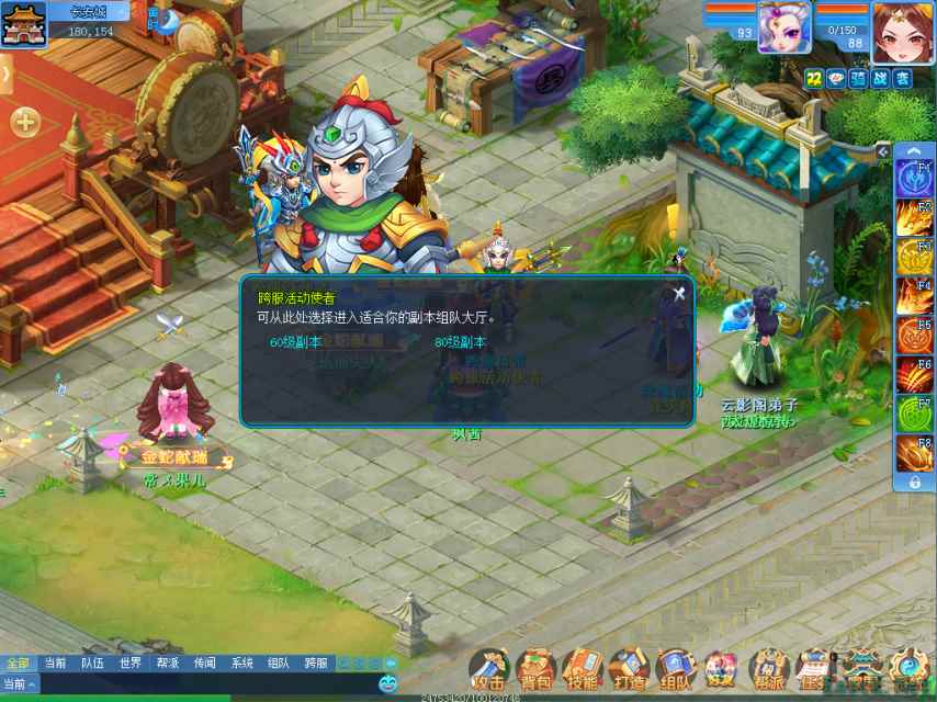 活用跨服活动功能,你就再也不用担心想做日常的时候朋友不在线啦。那么事不宜迟,快去跨服活动使者那里报到,选择你想挑战的玩法,跟其他服务器的少侠联手,共同对抗强敌吧! |