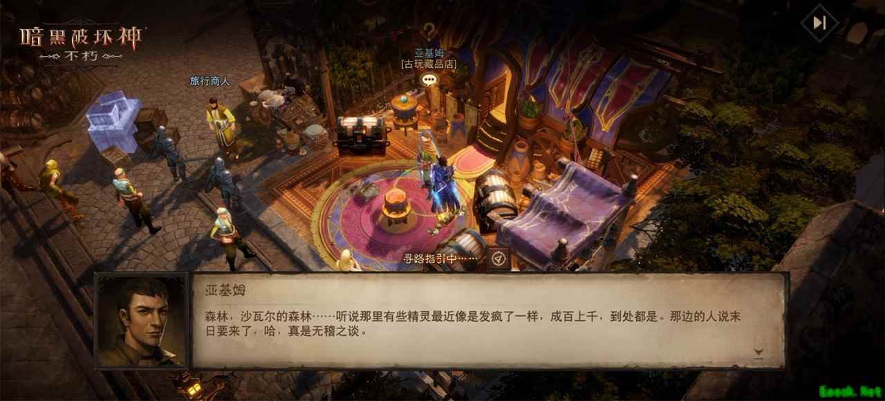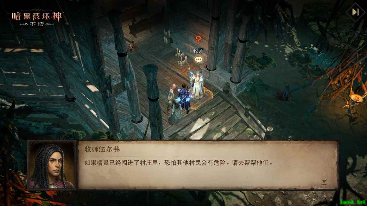 【到达沙瓦尔,腐化精灵与妮萨】 到达沙瓦尔荒野后,冒险者便进入了一个小村庄,向村民打听艾伯莱希特的消息。然而在村民口中却并未得到他的消息,只有一些关于一位神秘先知的描述。正当冒险者想要进一步了解情况时,大批精灵突然入侵,村民们四散而逃。在消灭了入侵的精灵后,冒险者在教堂见到了牧师伍尔弗和民兵艾克,并在他们的请求下重新返回村子查看情况时,却得知精灵已经撤往农场方向。