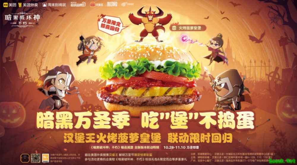 暗黑万圣季,这“菠”我吃定了 值得一提的是,在2022年10月28日到2022年11月10日期间,还会有三家《暗黑破坏神:不朽》联动主题店亮相于北上广三个城市,并有多项万圣主题趣味活动。 冒险者们可以通过美团外卖的汉堡王线上门店下单获取大菠萝联动款套餐,体验来自庇护之地的“大菠萝”汉堡风味! 限定好礼,惊喜buff加持 寒冷的万圣之夜,一份“火烤大菠萝”皇堡套餐能为冒险者们带来迎接新挑战的能量和勇气!不仅如此,还有万圣礼包buff加持,帮助冒险者扫除所有邪恶与黑暗! 活动期间,通过【美团外卖】下单购买汉堡王联名套餐,不仅有机会赢取汉堡王惊喜好礼,更有《暗黑破坏神:不朽》粉丝礼包、Diablo大菠萝万圣欢乐礼包、限定周边等多重好礼等待冒险者来解锁!