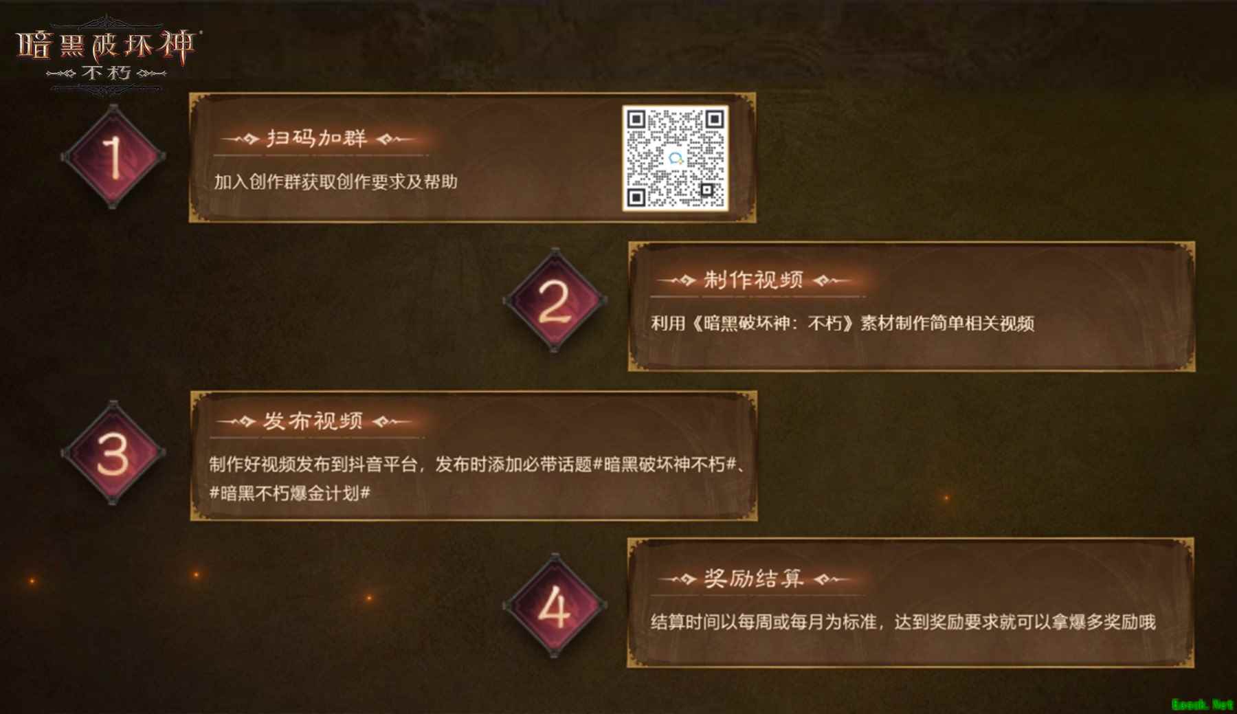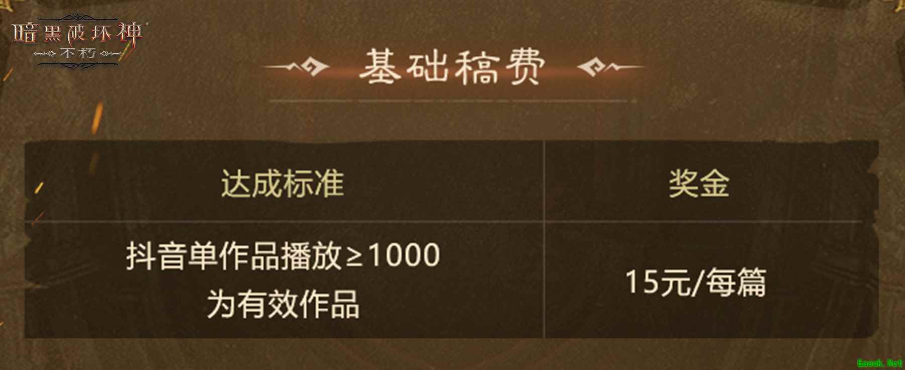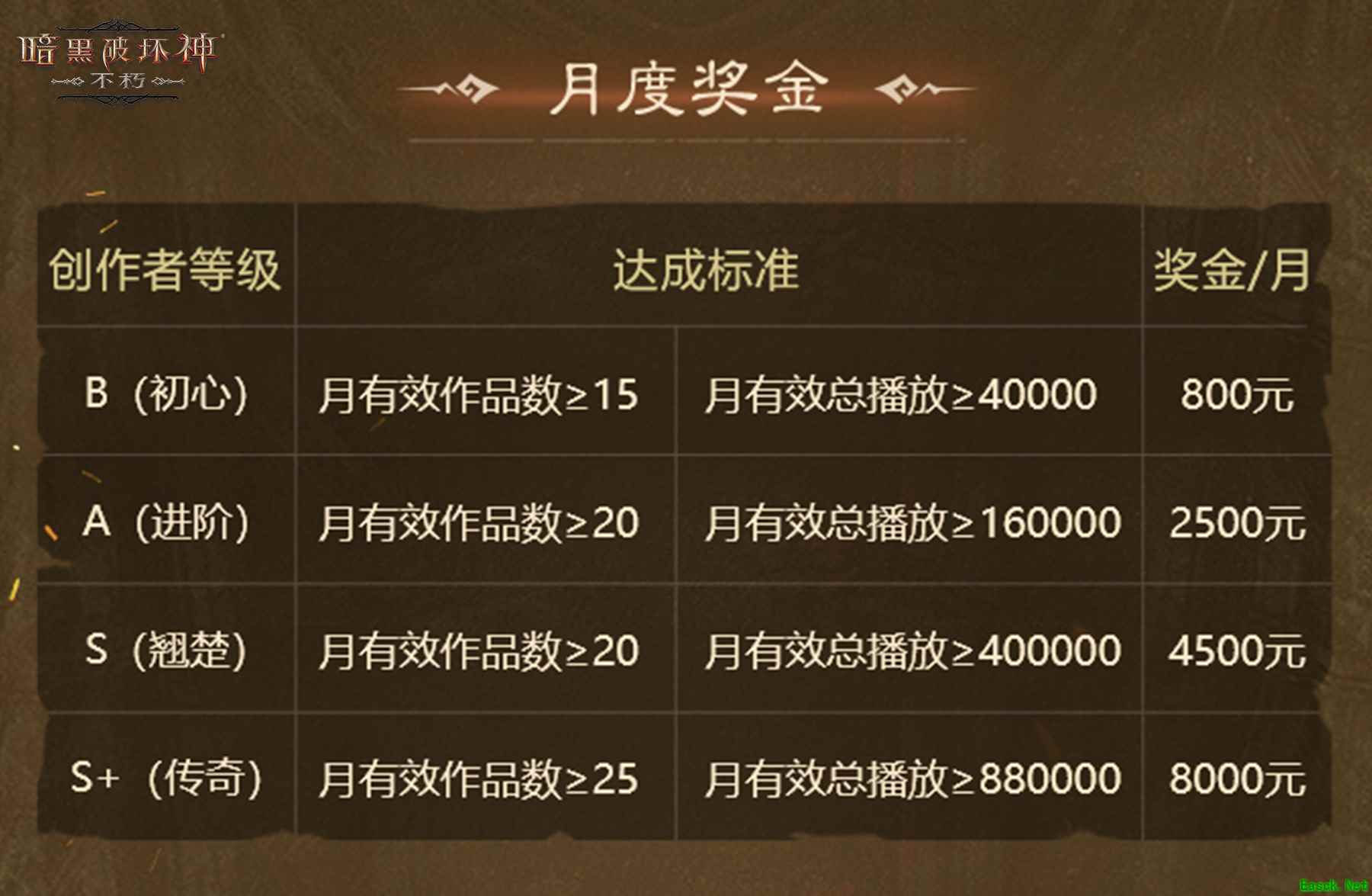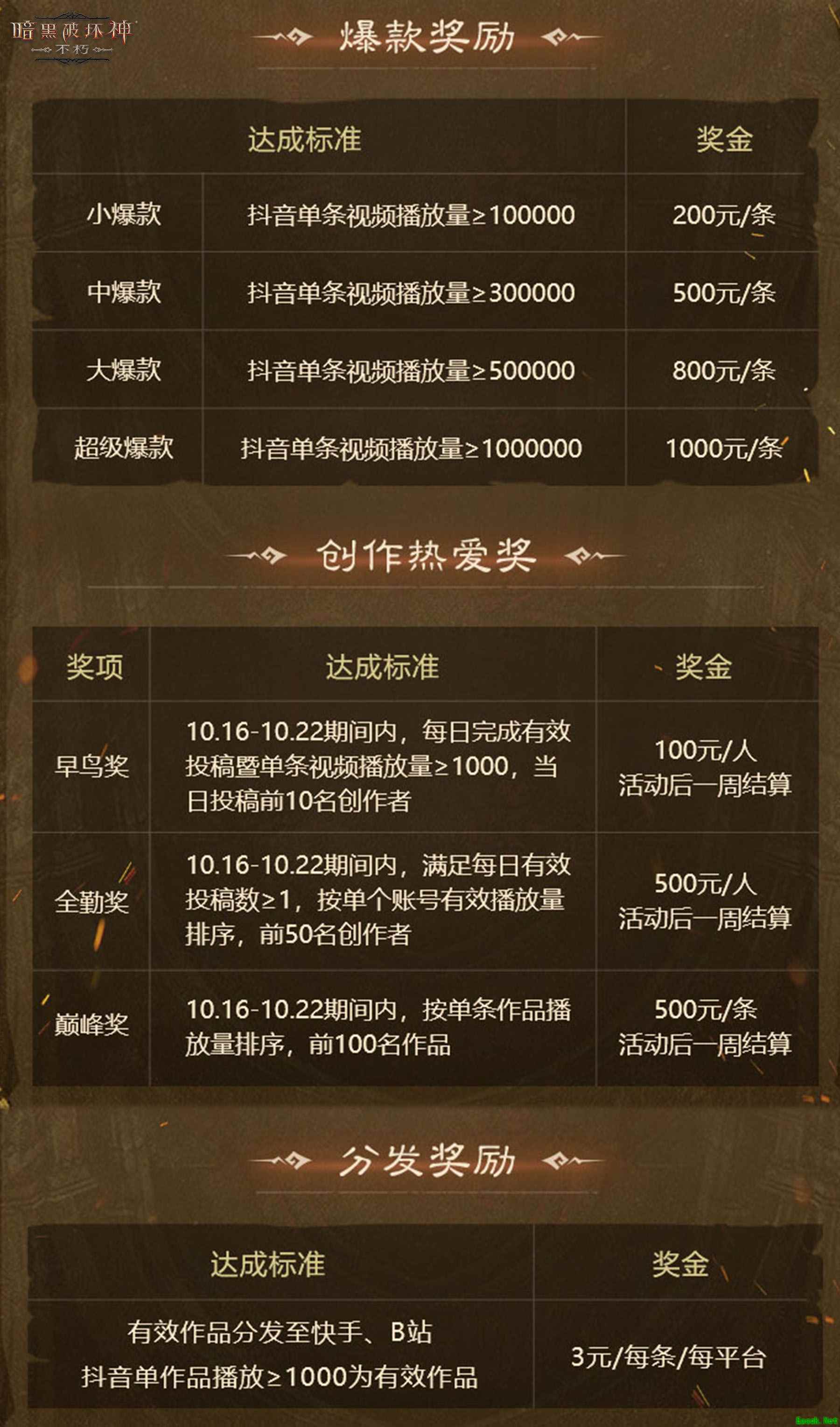 【月入过万轻松爆金 120万真金白银倾情回馈】 百万现金流,全力支撑爱好者快速成长!活动按照基础稿费、月度奖金、额外奖金(含爆款奖励、创作热爱奖、分发奖励)三类奖励每周/月进行定期结算,且均可叠加计算同时拿,轻轻松松就能月入过万!心动不如行动,赶紧加入创作群集思广益,发布原创视频至抖音平台参与“暗黑不朽爆金计划”,百万元大奖等你来瓜分! 原创内容按篇结算,发布越多收获越多!基础稿费按照有效作品(抖音播放≥1000)数,以周为单位进行结算。满腔热血无处撒?《暗黑破环神:不朽》以看得到的回报助力每一个创意的落地,让每一个玩家都能激情创作!