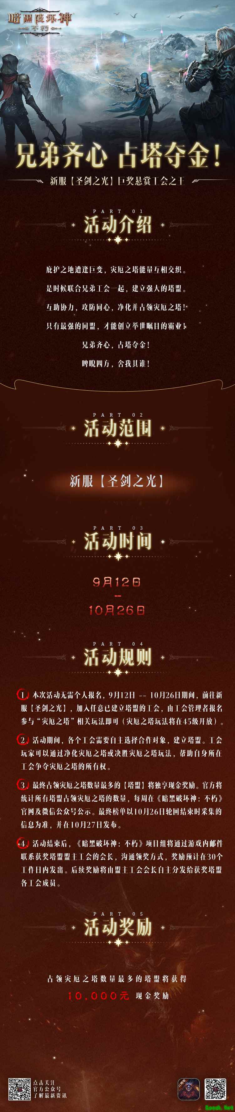 【建立塔盟征战四方 巨额现金嘉奖王者】 携手立塔盟,齐心创霸业!一场意料之外的变化,在庇护之地掀起狂澜。为应对危机,曾经各自为战的工会将舍弃前嫌,在《暗黑破坏神:不朽》2024秋季版本【圣剑之光】中并肩作战!新版本中庇护之地迎来全新灾厄之塔玩法——塔盟,玩家需要联合兄弟工会建立强大的塔盟,同心同德征战夺塔,圈地为王创立一份基业。现在前往新服“圣剑之光”创建工会组建塔盟,即可角逐庇护之地最强联盟!在新玩法中,塔盟盟主不仅可以占领三座灾厄之塔,还能将在决胜灾厄之塔玩法中攻克的塔转移给同一塔盟的其他工会,从而实现占领更多灾厄之塔的目标。此外,当同一塔盟的工会在决胜灾厄之塔玩法中被宣战时,其他工会可以互相支援参战。截止10月26日,最终占领灾厄之塔数量最多的塔盟将独享10000元现金奖励,成为真正的工会之王!