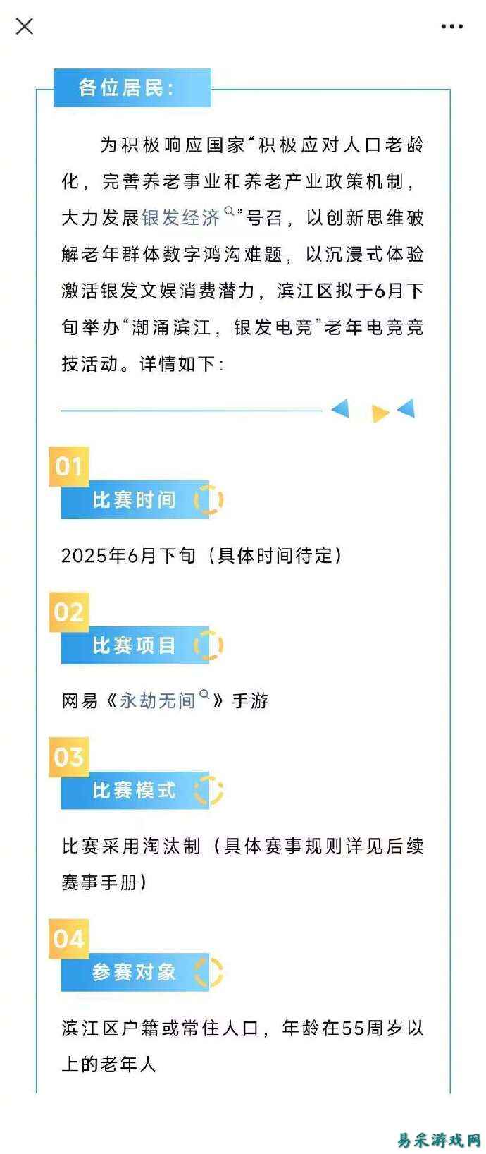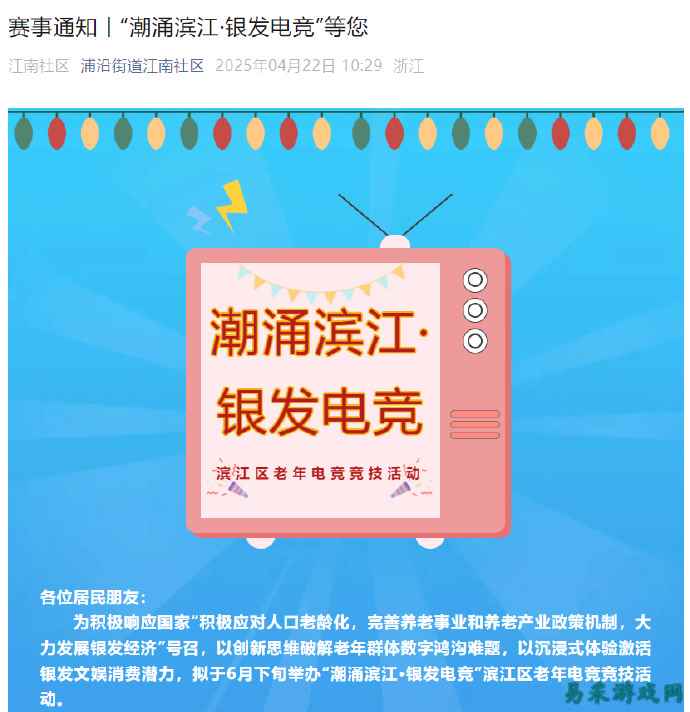 浙江省杭州市下属社区公众号今日发布了举办“潮涌滨江·银发电竞”滨江区老年电子竞技的活动通知,比赛将于6月下旬举办,项目为网易《永劫无间》手游。 比赛采用淘汰制,参赛对象为滨江区户籍或常住人口,年龄在55周岁以上的老年人。 公众号原文写道:为积极响应国家“积极应对人口老龄化,完善养老事业和养老产业政策机制,大力发展银发经济“号召,以创新思维破解老年群体数字鸿沟难题,以沉浸式体验激活银发文娱消费潜力,因此拟于6月下旬举办本次的老年电竞竞技活动赛事。