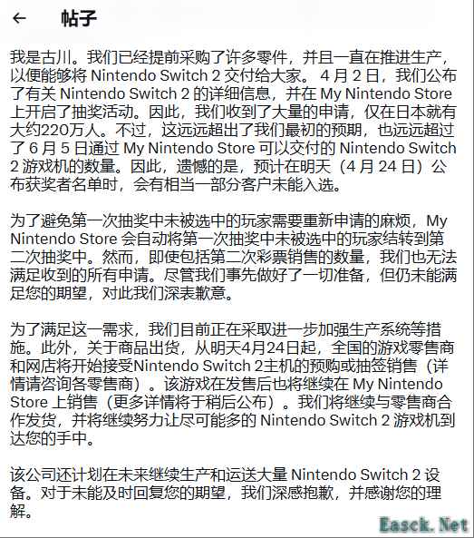 古川提到虽然第一轮抽选没中的玩家会自动进入第二轮抽选,但已经确定无法满足所有的玩家,因此玩家致歉。 同时,古川表示已经开始加大整个Switch2的生产,将继续努力把游戏机送到顾客的手上。 |