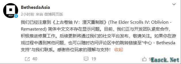 4月23日,微软与贝塞斯达(B社)公布了《上古卷轴4:湮灭重制版》的消息,游戏在公布的同时正式发售。游戏上架Steam平台后斩获了大量好评,不过有玩家在游玩过程中发现游戏的中文汉化存在问题。 今(24)日,B社对于国内玩家的反馈做出了回应,B社官博发文称,已经注意到了中文文本的问题,目前正在与开发团队积极推进修复工作,后续会发布相应的更新。 以下为微博原文: 我们已经注意到《上古卷轴 IV:湮灭重制版》(The Elder Scrolls IV: Oblivion - Remastered) 简体中文文本存在显示问题。目前,我们正与开发团队紧密合作,积极推进修复工作。后续更新将通过我们的社交平台发布,敬请关注。如果你在游戏过程中遇到其他问题,也可以随时访问评论区中的跳转链接至“中心 - Bethesda支持”与我们联系。感谢各位玩家的理解与支持! |