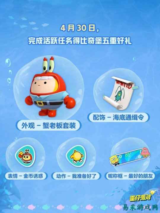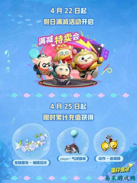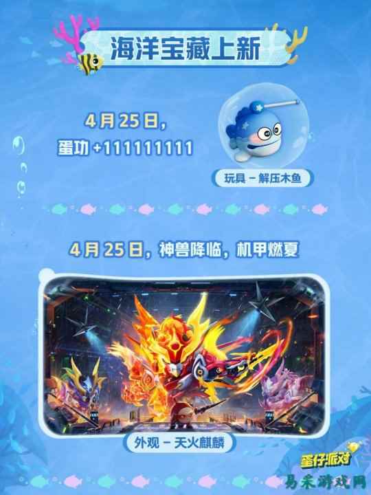 准备好一起下海了吗?国民原创乐园游戏《蛋仔派对》五一版本「海底大冒险」将于4月30日快乐启航。深海福利炸弹、海底奇趣探索……就等蛋仔们开启冒险啦! ![]() 【深海福利炸弹,共度美好假期】 4月26日起,深海福利来袭,让海底冒险更快乐! 60枚彩虹币大放送,趣萌外观<小象气球>免费得,还有多款潮流动作、表情等蛋领取! ![]() 新朋友登陆蛋仔岛,比奇堡五重好礼送送送!4月30日,完成活跃任务即可得外观<蟹老板套装>、配饰<海底通缉令>、表情<金币诱惑>、动作<我准备好了>、昵称框<最好的朋友>! ![]() 假日特惠不能停,满减累充全都有!4月22日起,满减特卖会开启,全场折扣9折起,每满300蛋币可减免50蛋币!4月25日起,限时累充得梦幻至臻面饰<蝴蝶花环>,超萌yoyo<气球猫咪>!赏花觅蝶rua小猫,蛋的假期要足够浪漫! ![]() 【海底新鲜不断,开启奇趣探索】 新角色上线,不一样的快乐等你体验!4月25日,远程射手<劝学小子>强势加入超燃!5月8日,卢修斯穿越战场来“挖煤”! ![]() 小蛋仔,一起抓水母吧!4月30日,《蛋仔派对》×《海绵宝宝》联动重磅开启,免费福利、蛋仔岛趣味活动、联动外观配饰、农场装扮同步上线! ![]() 遗忘尽头,苦痛新生!4月30日,追捕者“丧心护士海瑟”、逃生者“水鬼·伊文”加入逃出惊魂夜,最特别的审判即将开启! ![]() 5月1日,神奇艾比全新<双旋实验塔>挑战即将上线!各位训练师们,快准备好和你的最佳阵容一起深入<双旋实验塔>,开启惊险挑战吧! ![]() 5月1日,揪出捣蛋鬼新地图<深海集市>重磅上线!在汉堡店吃汉堡,在水母田抓水母,超多有趣任务等你体验! 坏蛋<野心蛋>、好蛋<矿工蛋>、中立蛋<魅惑蛋>加入战局!可以强制结束会议的野心蛋,可以通过任务换取一次其他好蛋技能的矿工蛋,可以强制一名玩家和自己投出一样的票的魅惑蛋!全新角色全新变局,这次胜利的又会是谁? ![]() 5月1日,“蛋仔守护蔚蓝海洋”特别联动开启,一起关注海洋生态!还有线下艾比小镇跨越次元而来,邀蛋来打卡! ![]() 【海洋宝藏上新,邀蛋焕新一夏】 4月25日,宝藏上新,好玩的好看的应有尽有! <解压木鱼>随时开敲,蛋仔的解压新玩具!机甲<天火麒麟>上线,燃爆整个夏天! ![]() 4月29日12点,揪出捣蛋鬼玩法上线新座椅<潮汐贝壳椅>,成功抽取即可同时拥有捣蛋鬼椅子和可在蛋仔岛使用的同款玩具! ![]() 5月1日,首款至臻级乐器<钢琴·星穹回响>上线!还有超多趣味动作、配饰、滚动特效等你解锁! ![]() 5月2日,上古神兽揭艾比新篇,首只“双属性艾比”<枫洛可>揭开面纱! 还有两只神奇艾比<霞光鱼>与<星云狮>也即将登场!专属技能<梦境链接>和<闪耀流星>,听上去就十分梦幻!蛋仔们都能联想到什么呢? ![]() 星座典藏背饰<曙光金牛座>、萌趣外观<吗喽默默>现已上线!还有更多惊喜好物每周上新,敬请期待! ![]() 4月30日,国民原创乐园游戏《蛋仔派对》五一版本「海底大冒险」即将快乐启航,期待小蛋仔们一起开启冒险! 【关于《蛋仔派对》】 咔咔~欢迎光临蛋仔岛!(*?▽?*)《蛋仔派对》是一款拥有5亿玩家的国民原创乐园游戏。在这里,你将化身Q萌的蛋仔,在盲盒机背后的神秘世界——蛋仔岛,展开一段奇妙的闯关之旅。游戏内含上百张风格各异的地图关卡、数十种休闲娱乐玩法,不怕手残,趣味无穷~海量高萌盲盒外观,来邂逅你的心动款!自由度极高的乐园编辑器,助你打造独一无二的乐园地图!更有充满脑洞与想象的蛋仔乐园,集结上亿张玩家原创乐园地图,等你和蛋搭子一同游玩打卡! |