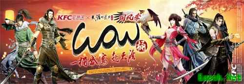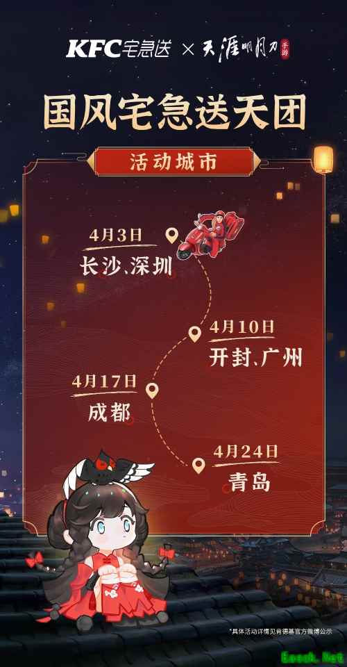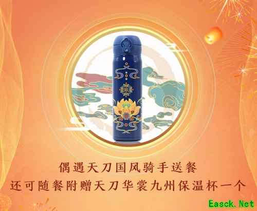 国风宅急送天团启程! 3月29日-4月25日每周六,在指定城市购肯德基宅急送WOW桶,备注暗语“一桶盛宴赴天涯”还有机会偶遇天刀国风骑手送餐。所有被抽中的幸运少侠都将加赠天刀华裳九州保温杯周边一个!