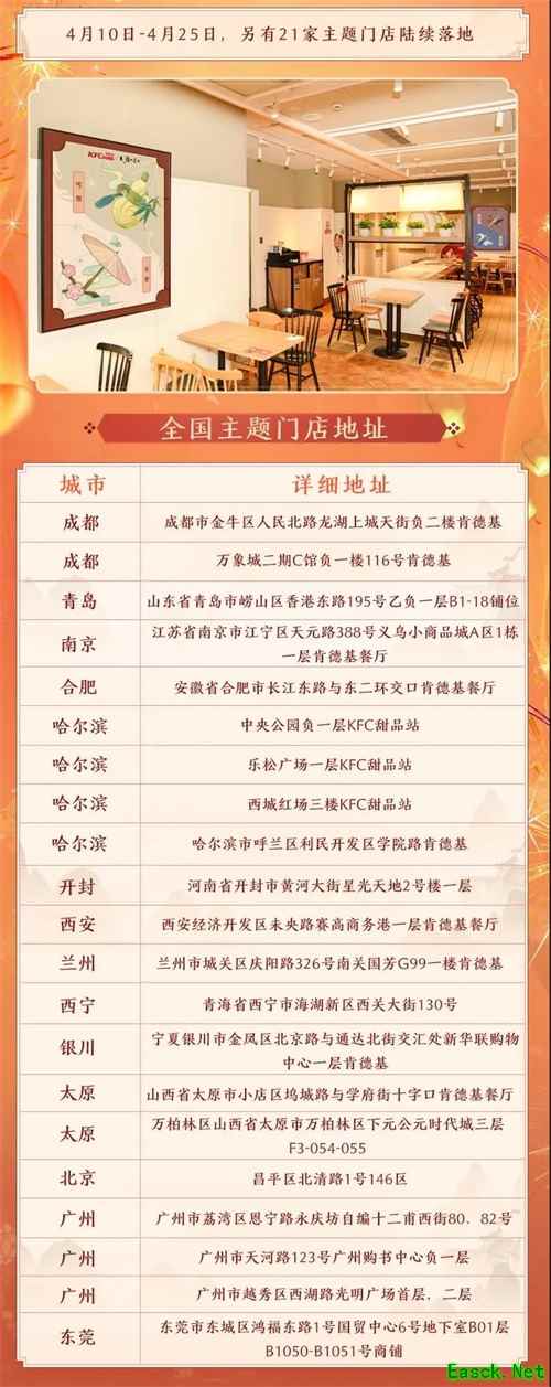 (*主题店装潢示意图) 4月10日-4月25日,另有21家肯德基天刀主题门店将一齐上线,刀妹已经把地址整理好了,少侠们可以就近前往哦~