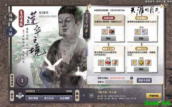 客从何来,佳期有柒。天刀线下携手永定客家土楼共庆七周岁生日,5月28日让我们相约星河巨幕观看直播获取最新IP爆料与海量庆生福利。线上线下福利连轴转,更有系列主题庆典活动,在探究源远流长的客家文化的同时,共赴天刀年度狂欢! 天赐献礼七周年 多种玩法大焕新 莲华之境S2全新赛季开启,多重更新优化来袭。新玩法不仅优化了匹配时间,更在对局之中加入了印记、莲华币、装备、天赋、秘技等多种元素协助少侠更好地面对变幻莫测的战场。 全新赛季的莲华之境周一到周五为单人场,周六周日和节假日为组队场,战局开始时,所有参赛的少侠将会登上宗师号。并在飞行期间可以随时选择降落至任意地点。落地后,少侠可以通过击杀怪物、开启宝箱等方式获取装备和物品。