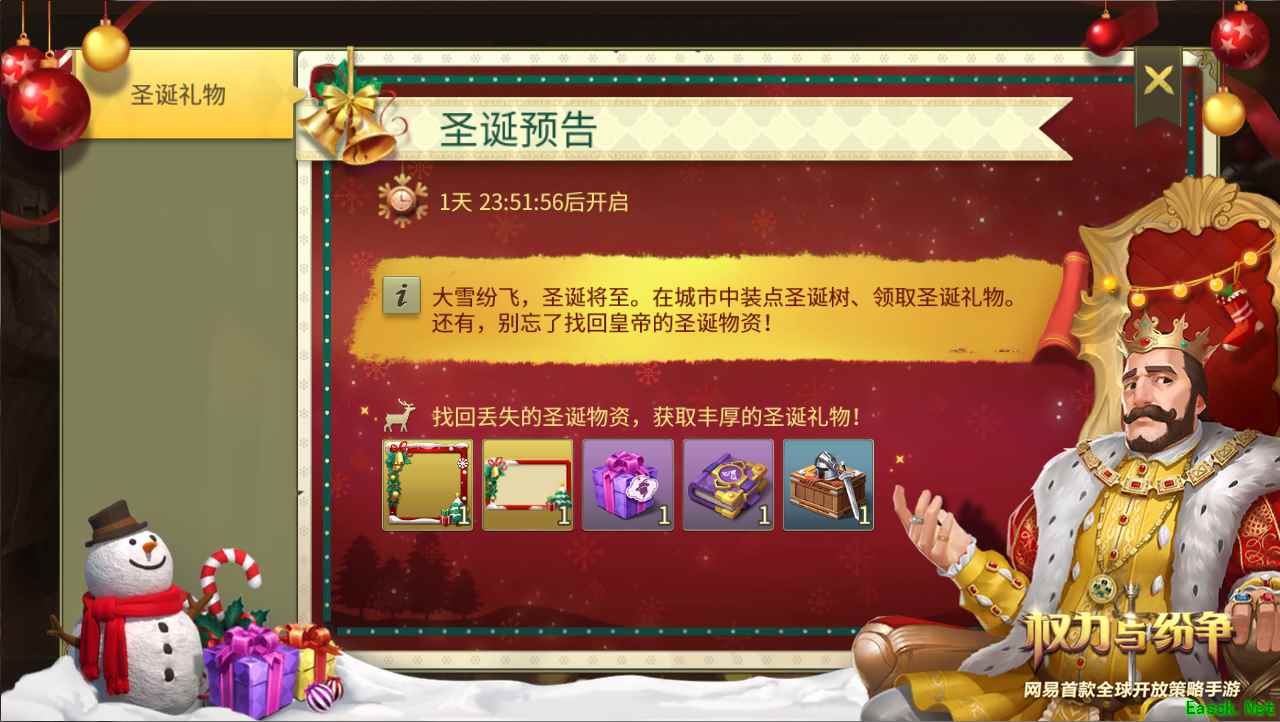 (玉宇天阙城堡皮肤) 天道酬勤,学习史诗战技。当踏上大陆的领主们逐渐熟悉游戏之后,法维拉大陆也为每位玩家准备了丰厚好礼。领主们每日登陆游戏完成指定签到任务,即可获得下一阶段的丰厚奖励,史诗技能残卷、海量金克朗、高级神秘地图等你来发现! 圣诞将至,强盗们却开始不安分起来,帝国的物资散落在强盗营寨与敌对城市里,玩家需要通过战斗找回物资并上缴给国王,根据物资数量玩家将获得圣诞限定头像框、限定对话框等奖励,排名优胜者更有惊喜的排行奖励!此外,玩家领地还将拥有圣诞树和雪人,参与节日限时互动,还将获得专属节日好礼!