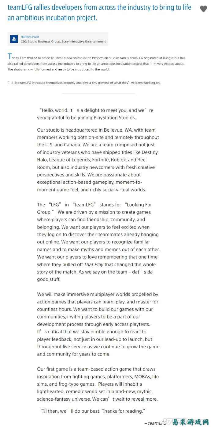 索尼成立全新工作室TeamLFG 汇聚LOL等知名游戏开发者