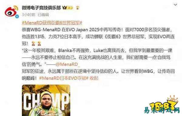 在刚刚落下帷幕的格斗游戏界年度盛事 EVO Japan 2025 大赛中,电竞舞台被一位耀眼的明星所照亮。代表 WBG 电子竞技俱乐部出征的选手 MenaRD,在《街头霸王 6》项目的激烈角逐中脱颖而出,成功登顶冠军宝座,同时也顺利拿到了 2025 年 EWC 电竞世界杯《街头霸王 6》项目的宝贵通行证 。 此次 EVO Japan 2025 大赛堪称高手如云,来自全球各地的 7000 多名顶尖选手怀揣着对格斗游戏的热爱与对冠军的渴望齐聚一堂。在这场没有硝烟的战场上,每一场对决都充满了不确定性与紧张刺激。MenaRD 却如同一位无畏的勇士,凭借着精湛绝伦的游戏操作、对局势的精准判断以及坚如磐石的强大心理素质,开启了一段震撼众人的征程,一路过关斩将,豪取令人惊叹的 13 连胜。 尤为值得一提的是,MenaRD 在比赛过程中遭遇了多达 7 位日本本土高手的强力阻击。日本,作为格斗游戏的强国,向来以深厚的格斗游戏文化底蕴和层出不穷的顶尖选手闻名于世。但 MenaRD 并未有丝毫退缩,他在与这些日本高手的对决中,充分展现出了自己独特的游戏理解与战术风格。面对对手的猛烈进攻,他巧妙地通过高压迫连招和精准的立回控制对手节奏;在陷入不利局面时,其出色的残局处理能力更是发挥得淋漓尽致,多次上演 “逆风翻盘” 的精彩戏码,一次次力挽狂澜,最终成功击败这 7 位强敌,成功蝉联《街霸 6》的世界总冠军,实现了个人在 EVO 大赛上的两连冠这一辉煌成就,用实力书写了属于自己的传奇篇章。 MenaRD 在赛后接受采访时,感慨万千地分享道:“这一年极其艰难,Blanka 不再强势,Luke 也离我而去,但我学到最重要的一课 —— 永远不要停止相信自己。在这充满挑战的人生里,我们都需要一点‘自我笃信’的勇气。” 这番话语不仅是他对过去一年艰辛历程的深刻感悟,更是对所有怀揣电竞梦想的年轻人的激励与鼓舞。在游戏版本不断更迭、角色强度发生变化的情况下,MenaRD 并没有被外界因素所束缚,而是始终坚定地相信自己的能力,通过不断地训练与钻研,探索出了新的游戏策略与角色玩法,在赛场上绽放出更加夺目的光芒。 MenaRD 此次夺冠,对于他个人而言,是职业生涯中的又一座里程碑;对于 WBG 电子竞技俱乐部来说,无疑是一剂强心针,极大地提升了俱乐部在全球电竞领域的知名度与影响力;而对于整个格斗游戏圈而言,则是注入了一股新的活力与激情,让更多人看到了格斗游戏的魅力与无限可能。如今,手握 2025 年 EWC 电竞世界杯《街头霸王 6》项目的入场券,MenaRD 即将踏上新的征程,相信他定会在即将到来的电竞世界杯舞台上继续发光发热,为我们带来更多精彩绝伦的比赛,续写属于自己的荣耀之路,让我们拭目以待! |