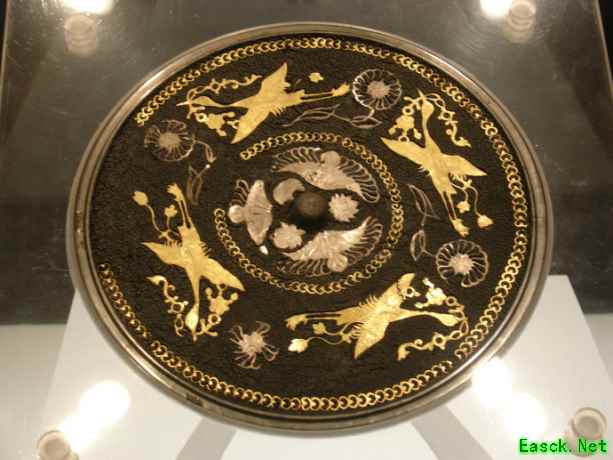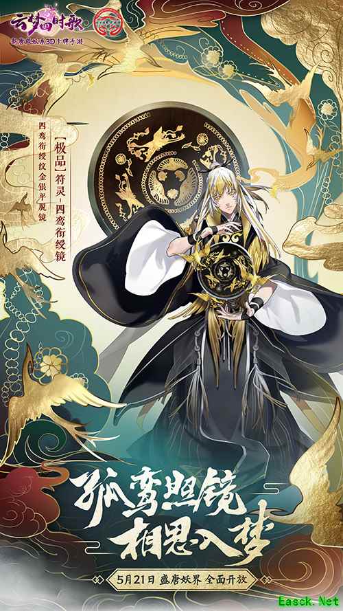 唐代文物四鸾衔绶纹金银平脱镜 游戏中的符灵“四鸾衔绶镜”,提取了文物原型中的黑、金两种颜色作为色彩主基调,而后结合了由唐代公卿朝服延伸改制而来的服饰,最终打造成为了一名手持文物古镜的长发俊俏男子。
