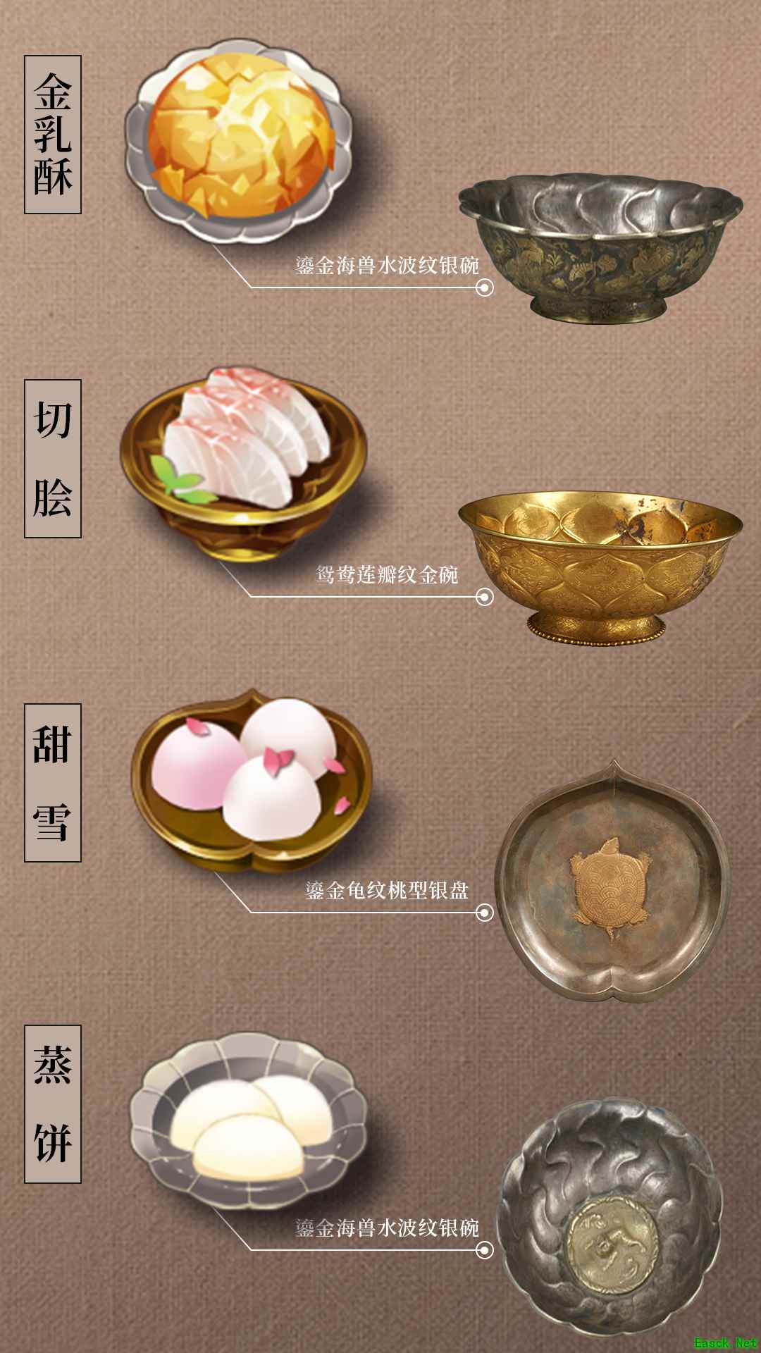 百妖图玩法中壁画展示 而在通过点菜上菜传递唐朝美食文化的“庙会”玩法中,则展示了诸如唐代鸳鸯莲瓣纹金碗、鎏金海兽水波纹银碗等珍稀的馆藏餐具类文物。