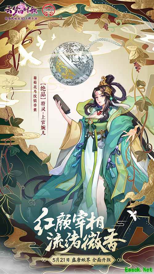四鸾衔绶镜符灵文物合作海报 游戏中另一文物定制符灵“上官婉儿”,其衣着花纹、制式等服饰设计维度有着浓郁的唐代风采,身上的配饰设计更是源自于“葡萄花鸟纹银香囊”这一曾登上过央视节目《国家宝藏》的国宝级文物。