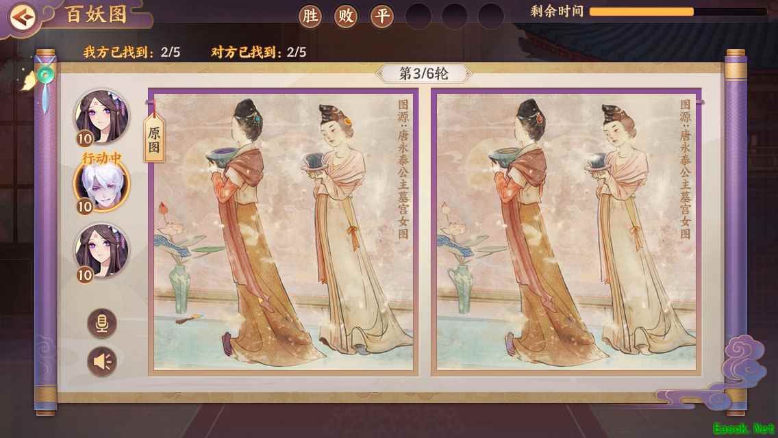 上官婉儿符灵文物合作海报 不仅游戏中的符灵取材自文物,《云梦四时歌》在玩法活动层面也与陕博馆藏的其他文物和传统文化进行了巧妙的结合。如旨在通过找不同玩法推广壁画文化的“百妖图”,设计灵感就源于陕博内珍藏的唐永泰公主墓宫女图、懿德太子墓阙楼图等壁画。