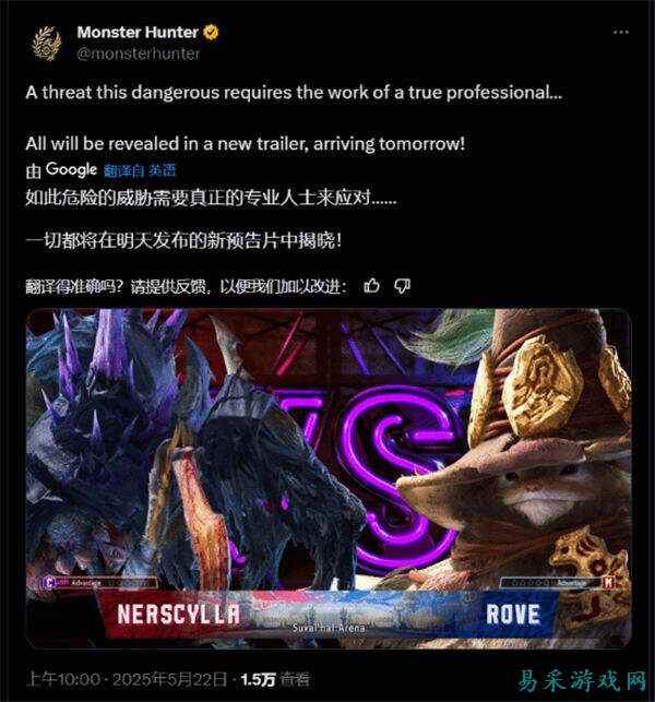 卡普空官宣《怪物猎人》与《街头霸王6》联动新预告片明日公开!网友:搁这挤牙膏呢!