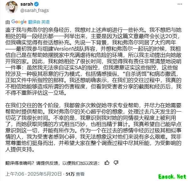5月17日,社交平台上一位化名为“Brick”的女性用户指控Florescent实施性侵。Florescent当日回应,否认指控并宣布将寻求法律协助。 “我已知悉相关指控并高度重视,但我坚决否认所有性侵指控,”她在贴子中表示,“目前我正在全力处理此事,并已着手寻求法律援助,以确定最佳应对方案——包括可以公开的信息范围,以及如何澄清事实。将在适当时机更新进展,”她补充道:“虽然我希望立即公开证据,但出于安全考虑已被建议暂缓披露。同时也请尊重另一方当事人的隐私。” 5月18日,Brick通过谷歌文档发布了后续声明,但目前司法程序尚未有结论。后续,拳头游戏就前VCT职业选手Ava “Florescent” Eugene的性侵指控正式发表声明:“5月17日,我们获悉针对某位参赛选手的性侵指控。此类指控性质极其严重,我们敦促掌握相关信息者立即联系执法部门。”虽然拳头游戏不会自行展开调查,但公司确认将全力配合司法调查,并将根据调查结果评Florescent未来参加VCT赛事的资格。“我们的赛事运营团队将全面配合司法调查,并评估这些指控是否影响涉事选手的后续参赛资格。”声明补充道。 随着事件不断发酵,越来越多的指控浮出水面,Florescent的前队友也站出来针对此事发表声明。 近日,游戏社区对拳头声明中隐去Florescent姓名的做法提出强烈批评,许多玩家将此与之前前类似事件中拳头直接点名涉事选手的处理方式进行对比。“当年Sinatraa面临类似指控时,调查刚启动就被禁赛。如今却变成‘将评估后续参赛资格’?”有玩家质疑道。另一位用户表示:“令人失望的是,你们没有像过去无数次那样直接公布姓名。” 前《无畏契约》记者George Geddes也批评拳头未启动内部调查及临时禁赛:“只字不提自主调查?没有临时禁赛?连姓名都不公布?(若因法律原因请明确说明——这是全球新闻界的惯例)。拳头应该明白自身声明措辞的影响力。” 截至目前,该事件尚未有明确定论,对于指控的真实性还需等待相关司法调查的结果。 |