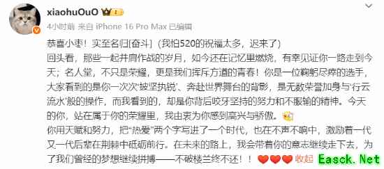 微博原文: 恭喜小枣!实至名归[奋斗](我怕520的祝福太多,迟来了) 回头看,那些一起并肩作战的岁月,如今还在记忆里燃烧,有幸见证你一路走到今天;名人堂,不只是荣耀,更是我们挥斥方遒的青春!你是一位鞠躬尽瘁的选手,大家看到的是你一次次‘披坚执锐’、奔赴世界舞台的背影,是无数荣誉加身与‘行云流水’般的操作,而我看到的,却是你背后咬牙坚持的努力和不服输的精神。今天的你,站在属于你的荣耀里,我由衷为你感到高兴与骄傲。 你用天赋和努力,把“热爱”两个字写进了一个时代,也在不声不响中,激励着一代又一代后辈在荆棘中砥砺前行。在未来的路上,我会带着你的意志继续走下去,为了我们曾经的梦想继续拼搏——不破楼兰终不还!!