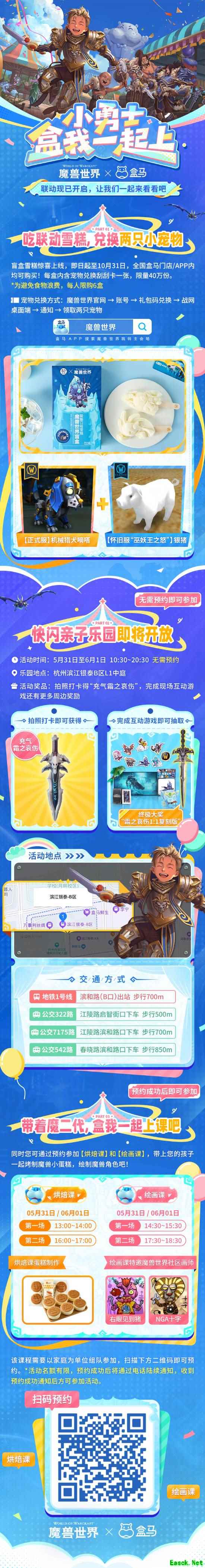 1、盲盒雪糕 即日起购买联名的盲盒雪糕,必得游戏内宠物兑换券刮刮卡一张,限量40万份。 2、亲子乐园 5月31日-6月1日在杭州滨江银泰举行亲子乐园快闪活动,玩家们拍照打卡即可获得“充气版霜之哀伤”玩具,完成现场互动游戏还可获得更多周边奖励。 3、课程 玩家可预约参加烘焙、绘画课,带着孩子一起烤制魔兽主题小蛋糕、绘制魔兽角色等。