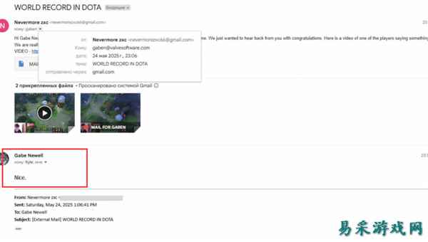 Valve总裁Gabe Newell近日向一群创造《Dota 2》史上最长对局比赛纪录的玩家送上了简短但意味深长的祝贺。 俄语区主播Grusti_ne组织这场有计划的排位赛,提前与队友和对手达成共识,准备共同创造多个《Dota 2》历史纪录。他们的目标不仅是刷新最长对局时间,还要打出最多击杀,并在多个英雄身上叠出前所未有的属性数值。 最终,这群热血的《Dota 2》在一场排名赛中鏖战了整整24小时1秒,成功刷新此前由2020年创下的6小时8分钟最长战局记录。 此外比赛还达成了诸多惊人数据: 击杀总数超过1700次 发条技师叠甲超2.5万 军团指挥官积累获得超过1.5万点额外伤害 为了让这场传奇比赛更有纪念意义,Grusti_ne还给Valve总裁Gabe Newell发送了一封邮件,详细介绍了这场对局,并附上了一些精彩片段。他在信中写道,玩家们都希望能听到Gabe本人对此的回应。 而让所有人惊喜的是,他真的回信了。几小时后,Grusti_ne收到了来自G胖官方邮箱的简短回复,内容只有一个字:“Nice(不错)”。简洁有力,但足够让玩家们欣喜若狂。 |