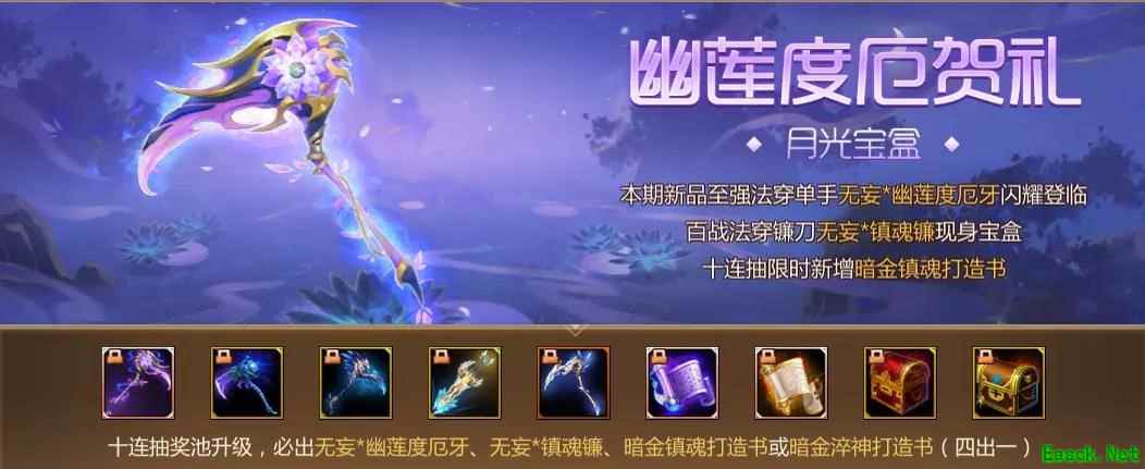 月光宝盒 此次“少年风流”新版本十连抽活动月光宝盒-幽莲罗生贺礼上线,投放全新法穿长柄无妄*幽莲罗生杖闪耀登场、 百战法穿长柄无妄*镇魂戟现身宝盒,十连抽限时新增暗金镇魂打造书。