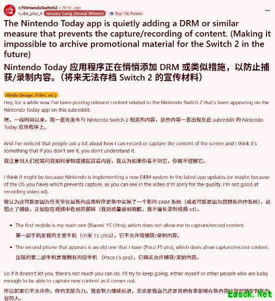 如果任天堂App偷偷加入DRM加密,可能会对玩家产生以下影响: 1. **限制了内容分享**:DRM可能会阻止玩家分享他们在App上观看的内容,如视频或截图。这可能对社交回馈和内容分享产生负面影响。 2. **增加使用成本**:加密可能会增加App的维护成本,这可能反映在应用售价或定期收费上。 3. **可能影响性能**:如果加密导致App过度占用资源,可能会影响整体性能。 4. **可能影响录屏和记录**:如果DRM旨在防止录屏或记录,这可能会限制玩家对自己的游戏体验进行记录和分享。这尤其影响那些喜欢录屏或喜欢保存游戏过程中的精彩瞬间的玩家。 5. **可能引发合规问题**:如果任天堂的App在海外市场提供加密功能,可能需要遵守各国的数据保护和消费者权益法规。如果处理不当,可能会引发法律问题。 6. **可能影响新玩家的体验**:对于新玩家来说,如果他们不知道这个App的加密功能,可能会对他们的使用体验产生负面影响。 总的来说,任何形式的加密都可能带来一些问题,尤其是对那些喜欢记录和分享的玩家来说。然而,每个App的加密方式和使用方式可能有所不同,具体的影响还需要看任天堂的具体实施方式。 近日,Reddit用户Cube_play_8发布了一则帖子,称Nintendo Today应用在最近的更新中悄悄加入了数字版权管理(DRM)或类似的保护措施,导致无法录制或捕捉相关的内容。 这一举措引发了不少用户的关注,尤其是在有关Nintendo Switch 2的推广资料和内容无法存档的问题上。 据Cube_play_8的描述,有大量网友询问他如何录制或捕捉Nintendo Today应用的屏幕内容。 在这些问题中,他注意到一个现象——一些用户无法通过手机设备录制或捕捉内容,而这一问题似乎与Nintendo Today应用的更新密切相关。 他进一步指出,Nintendo最近推出的更新可能引入了一种新的DRM系统,专门防止用户捕捉或录制应用内的内容。例如,在他的测试中,使用的小米15 Ultra手机无法录制内容,而另一部老旧的Poco F5 Pro手机则可以正常录制。 Cube_play_8表示,虽然他会尽力继续分享相关内容,或者依靠那些运气好的用户,但这一新的DRM措施显然使得一些玩家无法像之前一样轻松保存和分享Switch 2的内容。这一变化对于那些喜欢存档、分享或捕捉游戏素材的用户来说,显然是一个不小的障碍。 |