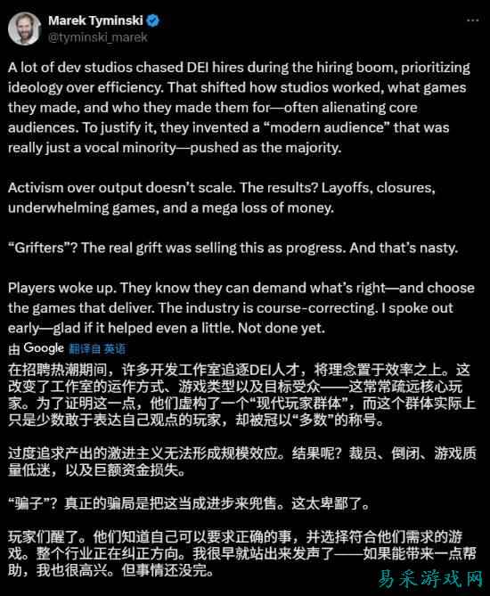 《堕落之主》发行商CI Games的CEO Marek Tyminski在推特发表了一篇动态,怒斥那些过度追求DEI目标而牺牲开发效率的工作室,并犀利的指出“把这当成进步来兜售才是真正的骗局” 原文内容: 在招聘热潮期间,许多开发工作室追逐DEI人才,将理念置于效率之上。这改变了工作室的运作方式、游戏类型以及目标受众——这常常疏远核心玩家。为了证明这一点,他们虚构了一个“现代玩家群体”,而这个群体实际上只是少数敢于表达自己观点的玩家,却被冠以“多数”的称号。 过度追求产出的激进主义无法形成规模效应。结果呢?裁员、倒闭、游戏质量低迷,以及巨额资金损失。 “骗子”?把这当成进步来兜售才是真正的骗局。这太卑鄙了。 玩家们醒了。他们知道自己可以要求正确的事,并选择符合他们需求的游戏。整个行业正在纠正方向。我很早就站出来发声了——如果能带来一点帮助,我也很高兴。但事情还没完。 |
