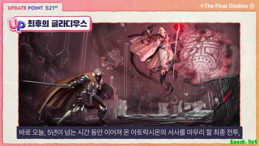 “最后的格拉迪乌斯”是为“阿图纳西温”五年叙事画上句号的终极内容。冒险家将直面《黑色沙漠》主线故事的核心人物——白女巫“伊莱兹拉”,并通过战斗中出现的过场动画,提前预览计划于下半年更新的“艾达尼亚(魔界)”部分剧情。“艾达尼亚”是连接《黑色沙漠》过去十年与未来十年的核心内容,去年曾在“卡尔佩恩宴会”上首次公开。 完成“最后的格拉迪乌斯”的冒险家可获得▲阿图纳西温最终选择箱作为奖励。开启该箱子时,可选择获取▲太初之锤或▲古代之锤之一,同时还将获得▲德基玛:誓约证物▲马哈的碎片▲特殊称号等多样奖励。