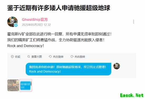 近日,《深岩银河》开发商GhostShip发文互动《绝地潜兵2》玩家:“鉴于近期有许多矮人申请驰援超级地球,霍克斯IV矿业部在此进行统一回复,所有申请无须审批即刻通过!我们的精英矿工们将勇猛作战,全力协助驱逐光能族入侵者!”