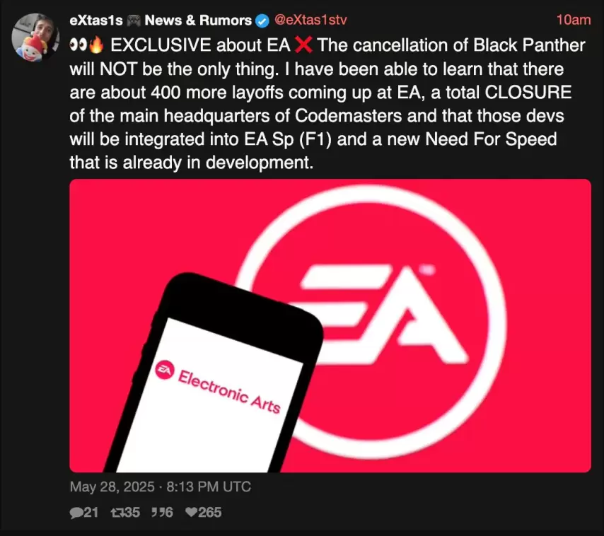 eXtas1s发推说:“关于EA的独家消息:取消《黑豹》,这还没完。我听到EA即将裁员400人,完全关闭Codemasters总部大楼,Codemasters受影响的员工将整合到EA Sports(F1)团队和新《极品飞车》开发团队中。” Codemasters曾开发过《尘埃》、《超级房车赛》等经典系列,但这家工作室被EA收购后表现不尽如人意。EA最近已经确认Codemasters已经不再开发《WRC》系列,而员工要么被裁员,要么被转移到其他项目中。而eXtas1s今天的爆料意味着EA将完全关闭Codemasters工作室,将员工转移到《F1》和《极品飞车》系列项目中。