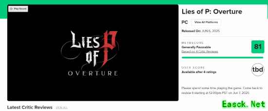 《匹诺曹的谎言》DLC“序曲”M站早期评分出炉:4家媒体评分均高于80!