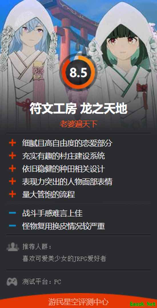 此外,我们为《符文工房 龙之天地》给出了8.5分的成绩,认为本作真的为这个系列开辟了一个崭新的起点。它并不能说有多么创新,但在种田、建设、经营、与恋爱等内容上,都以全心全意的投入尽可能做到了最好。详情请移步:《符文工房 龙之天地》游民评测8.5分 恋爱与收获的季节>>>