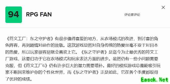 给出94分高分的RPG Fan认为,《符文工房 龙之天地》有很多值得喜爱的地方,包括农场模式的改进、讨喜的角色人设,以及剧情对于前作的致敬。无疑是迄今为止最优秀的《符文工房》游戏。