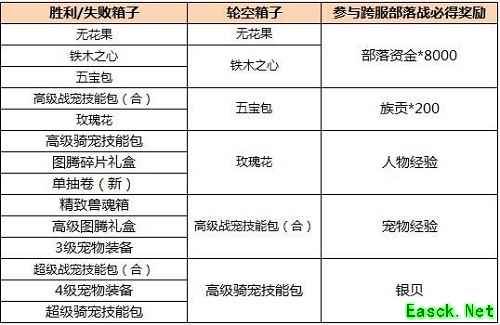 除了前三名部落能够获得不菲的奖励之外,进入跨服部落战全区服排行榜前100名的部落,按照排名先后,依次都能获得15%-20%的组队加成、50w-250w金贝的部落红包,和一定数量的优质部落拍卖内容。 总体而言,一个跨服赛季结束后,前100名部落都能得到不错的赛事福利,尤其是组队加成和部落拍卖行,可以为族员们的日常培养带来非常大的收益。 3、参战奖励 每参与一次跨服部落战,不管比赛最终结果如何,个人都能够获得一定的部落资金、族贡、经验和银贝奖励。比赛结束后,无论是胜利方还是失败方都会有内容不同的奖励箱子。打开后有一定机率获得4级宠物装备、超级宠物技能包、图腾礼盒、兽魂箱等实用道具。