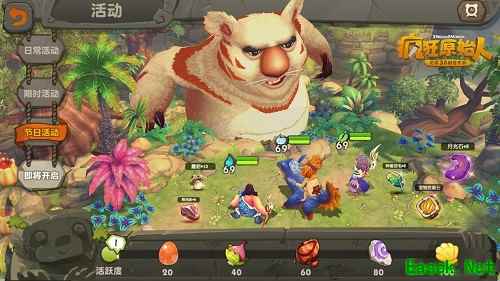 岩洞部落四处都是野兽,石壁上还有恐龙画像;夕阳原野上是一大片菜花地,地里长有巨大的不知名植物;远古海洋的珊瑚也比现代珊瑚大几倍,一切场景看起来都新奇无比,处处散发着未知危险。 【近百种原始动物集合 骑战一体养成玩法开启】 宠物的养成是《疯狂原始人-正版3D回合手游》中的核心玩法,仅仅是宠物种类,就多达几十近百种。除了影片中出现过的鹦鹉虎、猫头熊、鳄犬、猛犸象等动物,其中还新增了一些不曾在动画中见过的类型。想要拥有这些宠物,可以直接从宝库抽取,也可以攒碎片进行合成。