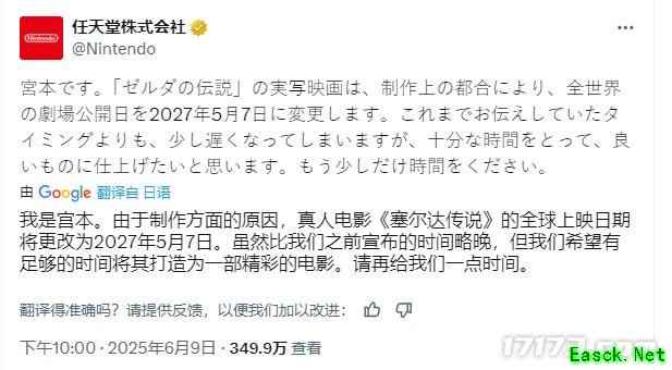 《塞尔达传说》真人版电影上映日期延至2027年5月7日