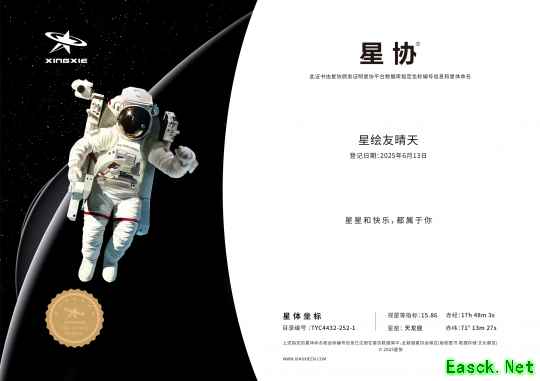 除了游戏中“点击就送”的星球外,《星绘友晴天》也在现实中赠与全体玩家一颗星星:编号TYC4432-252-1,以“星绘友晴天”命名(也代表全体玩家“星友”)。无论玩家在何处,只要抬起头,那里总有一颗星星、一份快乐属于大家。